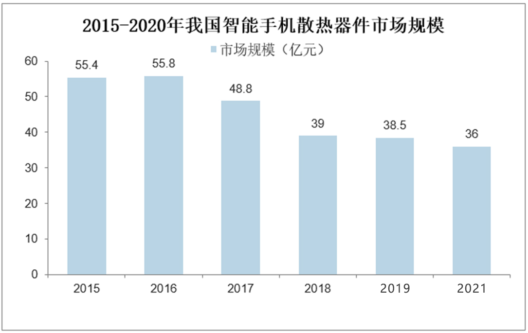 盡管手機散熱器件的地位越來越重要,但是由于技術的進步,手機散熱的成本也呈現出逐步下降的趨勢。例如在芯片采用外掛5G基帶的設計造成功耗及發熱更大的背景下,手機廠商傾向于選擇大容量的電池及更大面積的散熱來應對外掛5G基帶帶來的功耗及發熱提升,而不是進一步提升散熱器件的散熱能力。手機受限于設備的體積不可能像PC端一樣采取大體積的散熱設備和更加系統化的散熱設計,散熱設計往往要為更多的新功能讓步,因此國內智能手機散熱器件市場規模實際上呈現下降趨勢,2020年由于國內手機出貨量進一步下滑,我國智能手機散熱器件市場規模約為36億
